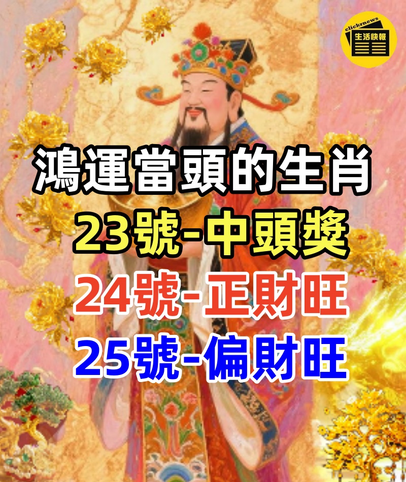 1/5 鴻運當頭的生肖:12月23號中頭獎,24號正財旺,25號偏財旺 以下是2025年12月23日至25日期間鴻運當頭的生肖,他們將在這幾天迎來好運與財富運勢的高峰:   2/5 23日:中頭獎的幸運生肖這一天貴人運強,特別是參加抽獎