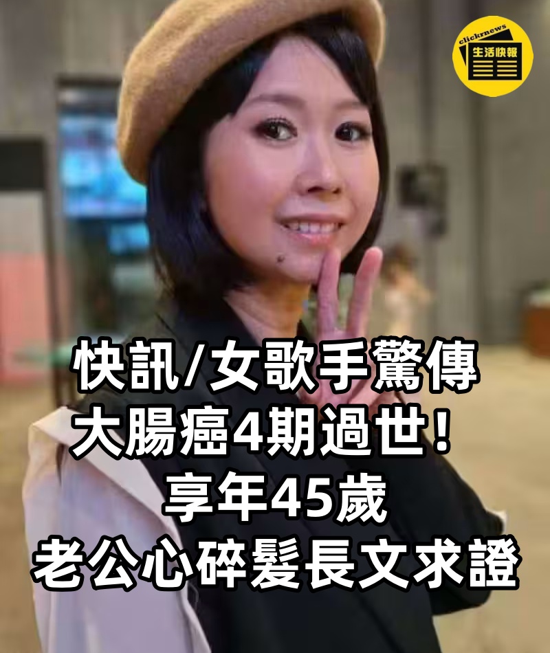 快訊/女歌手驚傳大腸癌4期過世!享年45歲, 老公心碎髮長文求證