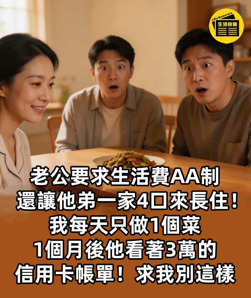 老公要求生活費AA制,還讓他弟一家4口來長住。我每天只做1個菜,1個月後,他看著3萬的信用卡帳單, 求我別這樣