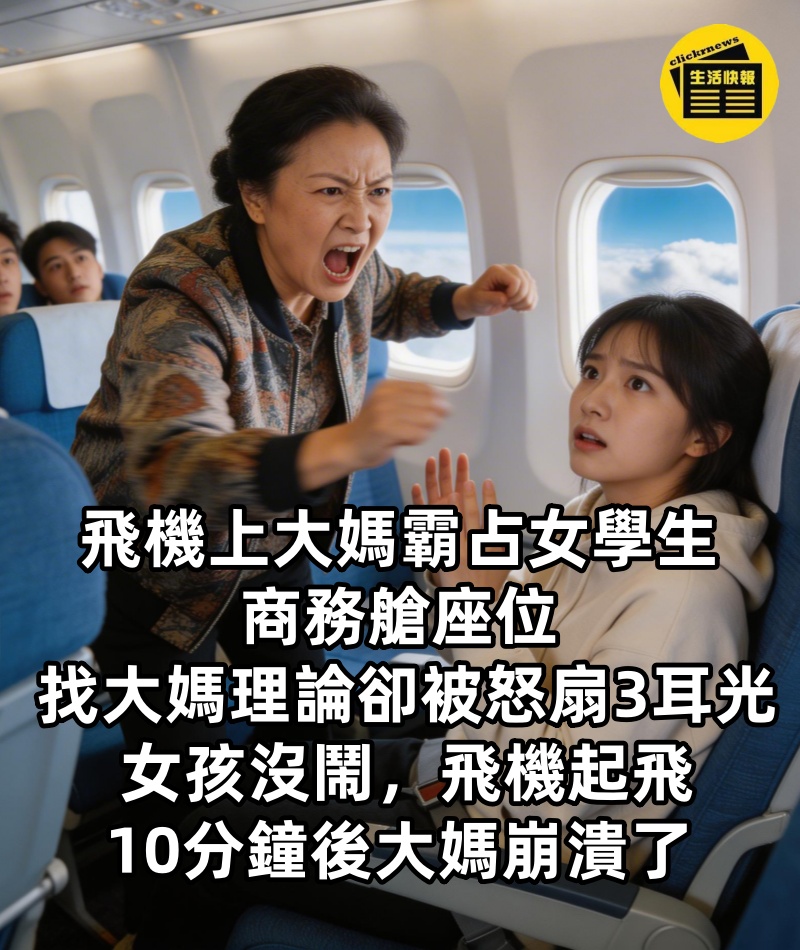飛機上大媽霸占女學生商務艙座位, 找大媽理論卻被怒扇3耳光, 女孩沒鬧, 飛機起飛10分鐘後大媽崩潰了