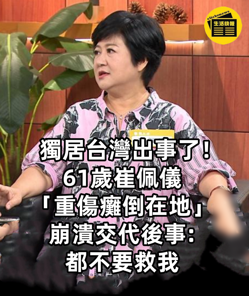 獨居台灣出事了!61歲崔佩儀「重傷癱倒在地」崩潰交代後事:「都不要救我」