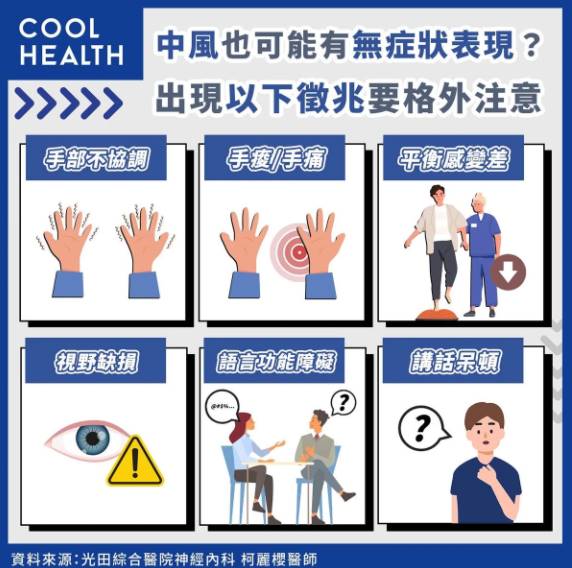 其實, 中風在發作前往往有些蛛絲馬跡,若能及時發現,分秒必爭地搶救,患者中風的死亡率可降低在 10% 以內。