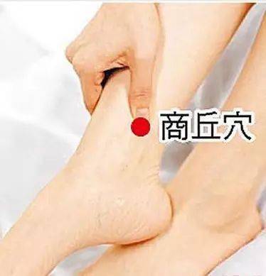 商丘穴,位置在內踝前下方的凹陷中,用手指按揉該穴位,保持酸重感即可,每次3分鐘左右,兩腳交替做。