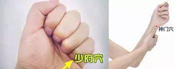 少府穴,位置在手掌心,第4、5掌骨之間,握拳時小指與無名指指端之間。按壓這個穴位不妨用些力,左右手交替。