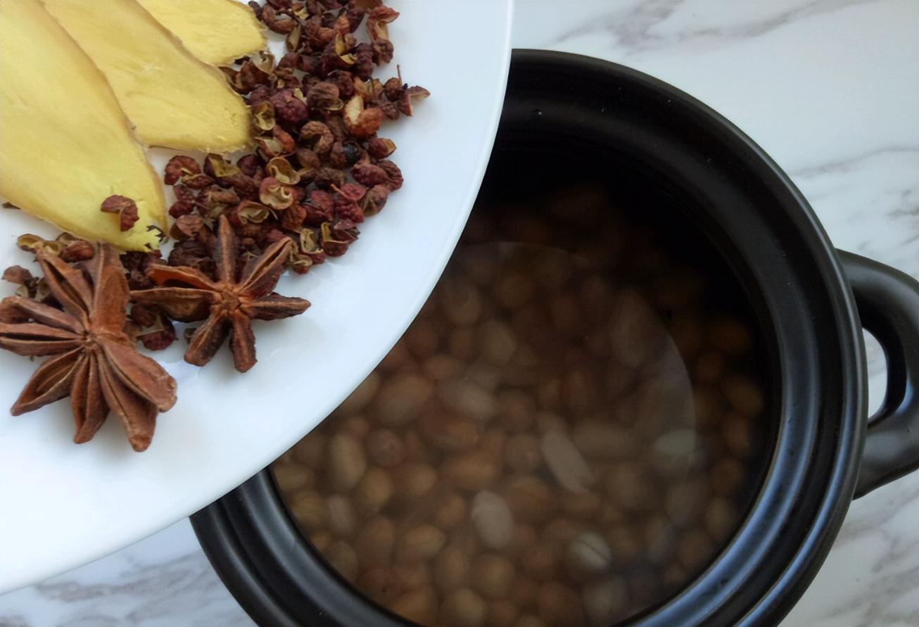 2.砂鍋中放入適量水,加入花生米、薑片、八角、花椒