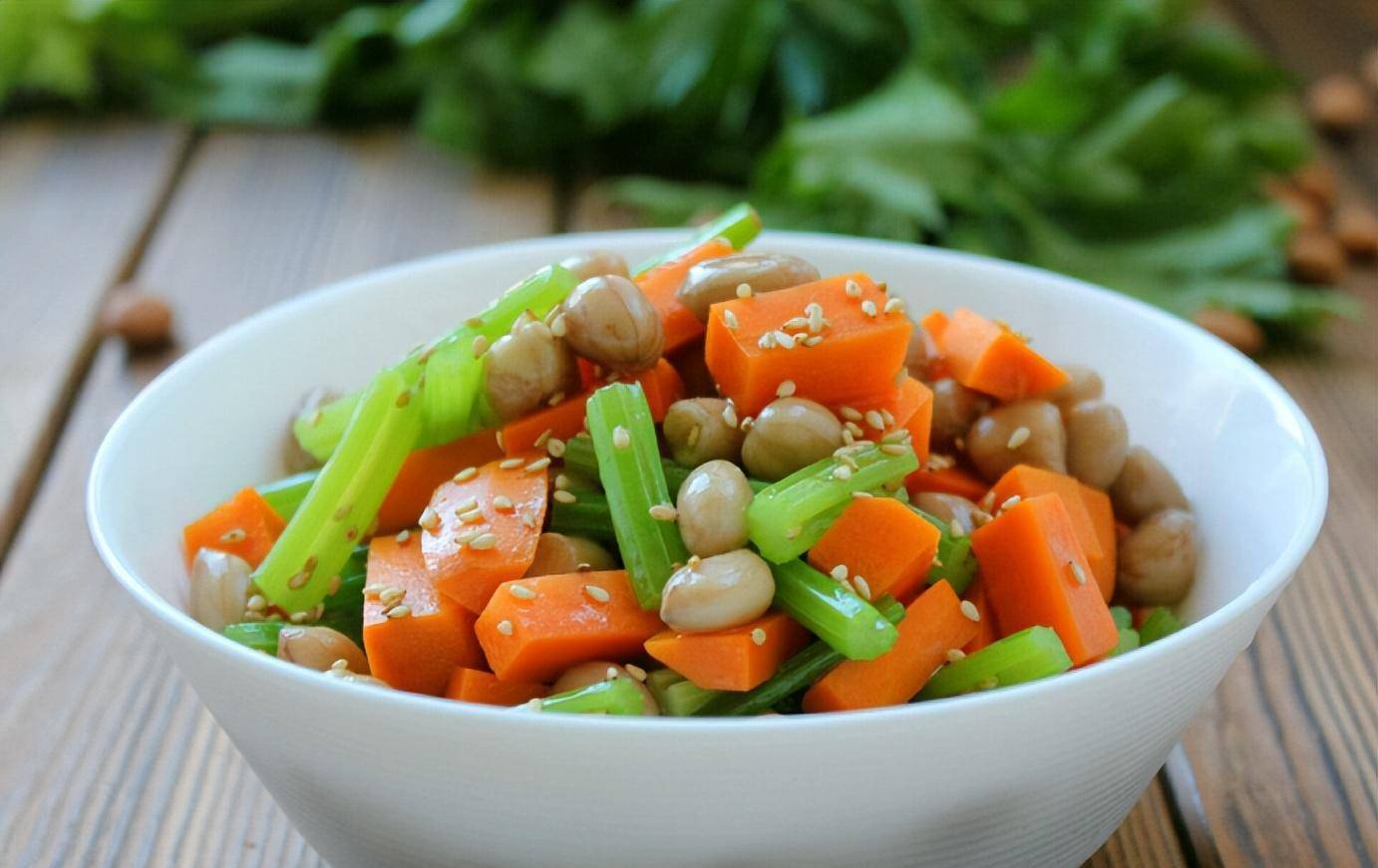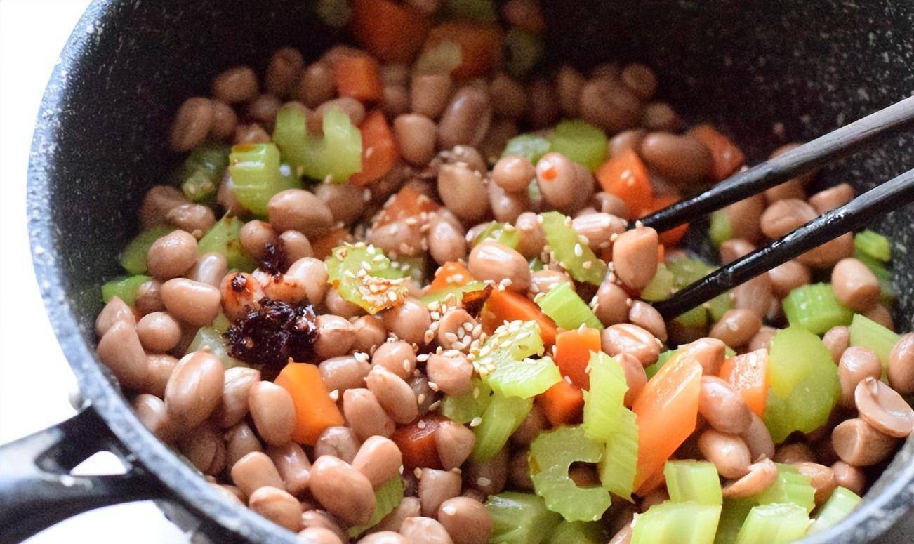 6.將煮好的花生米、燙好的芹菜胡蘿蔔放在一起,加鹽、雞精、香油、白芝麻拌勻即可