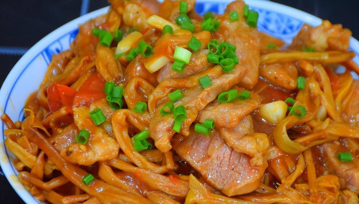 5.等黃花菜燢熟之後,將醃製好的梅花肉放入鍋中,用筷子鋪平,這樣容易受熱均勻,再蓋上鍋蓋,燜煮8分鐘,將瘦肉燜熟。等瘦肉斷生之後,淋入水澱粉,然後快速的翻炒均勻,就可以出鍋裝盤了,最後撒上蔥花,提香點綴。