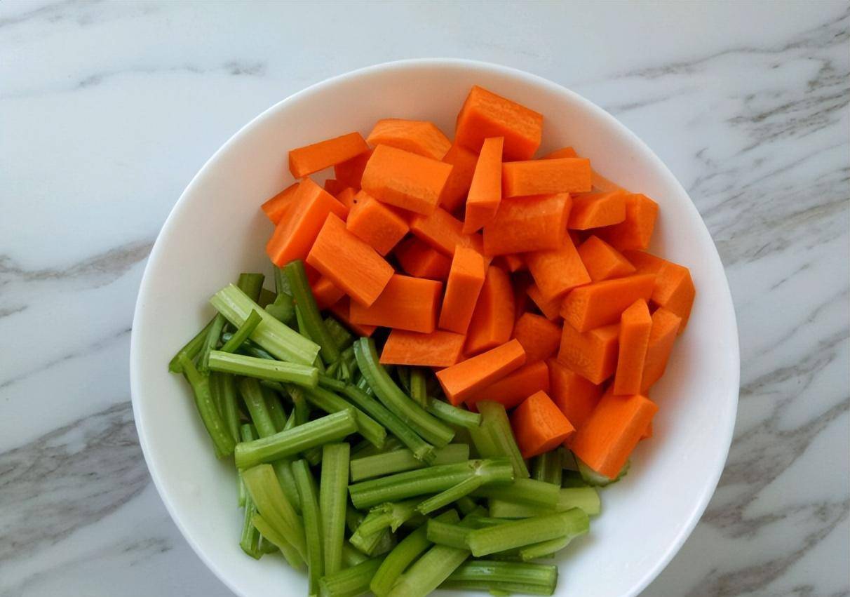 4.芹菜摘去芹菜葉,清洗乾淨切小塊;胡蘿蔔去皮清洗乾淨切小塊