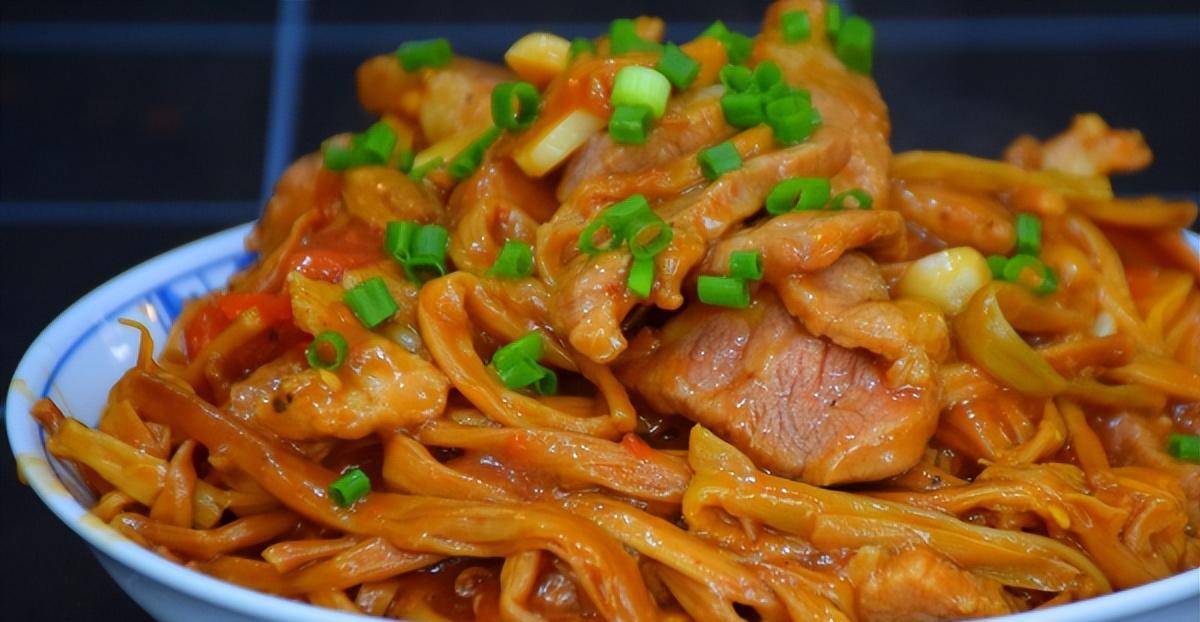 準備食材:乾黃花菜、豬肉、番茄、薑、蒜、蔥、生抽、蠔油、油、鹽、澱粉、胡椒粉、老抽