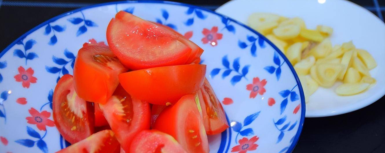 3. 將準備好的番茄切小塊,裝盤備用,將薑和大蒜切片,然後一起裝盤備用。最後把小蔥切成蔥花。