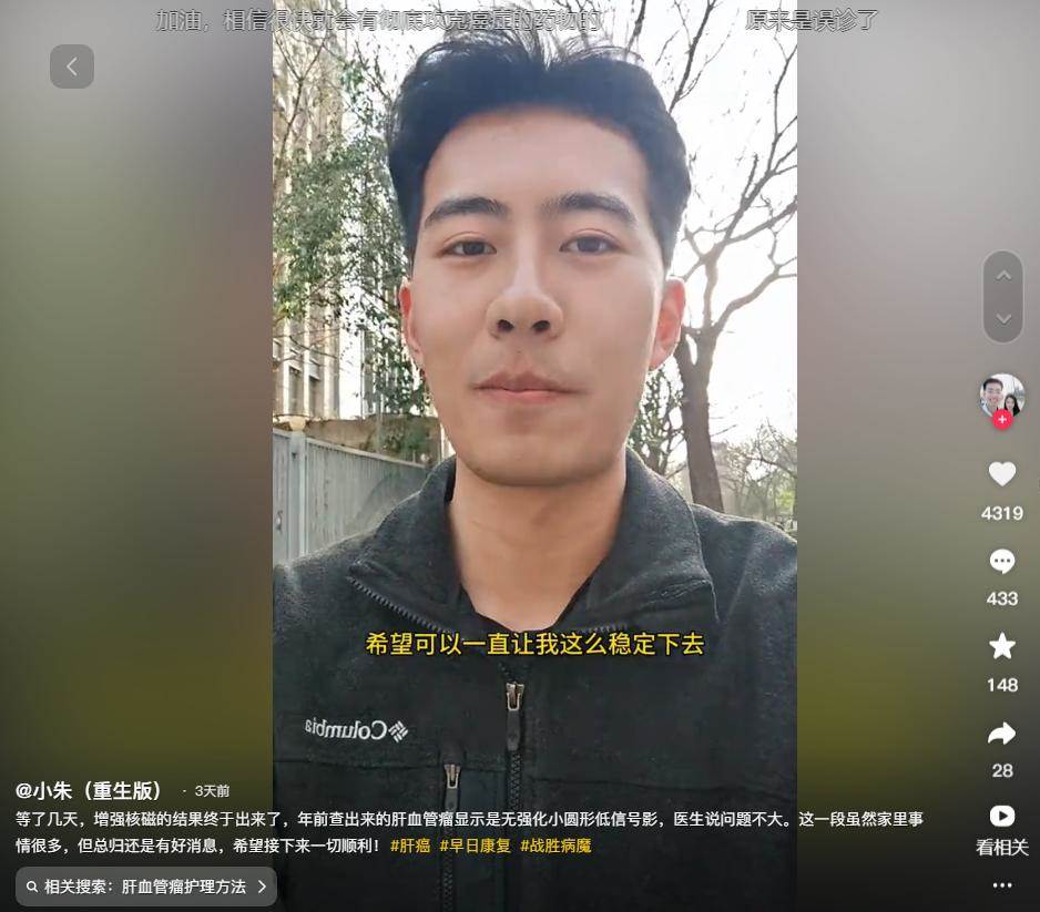 從他最新的視訊來看,他去上海復查了增強核磁結果顯示一切都好,年前他查出來的肝血管瘤顯示無強化小圓形低信號影,醫生告訴他沒什麼大問題。