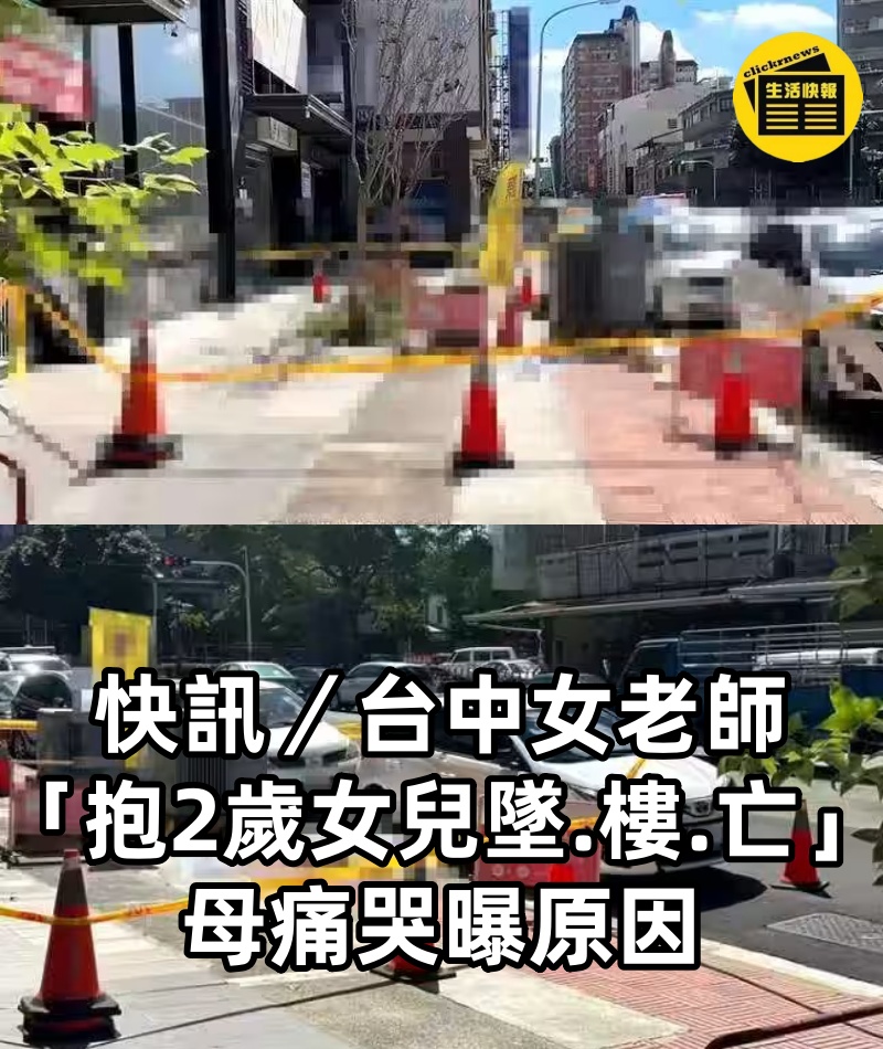 1/4 快訊/台中女老師「抱2歲女兒墜樓亡」!母痛哭曝原因. 台中市南區,今天(10日)早上8點,驚傳有母親帶著2歲的女兒墜樓,讓阿嬤得知消息後肝腸寸斷,遠從高雄趕往台中處理。 據悉,死者的老公才帶著大女兒出國,才沒多久就發生憾事,讓人看了鼻酸。