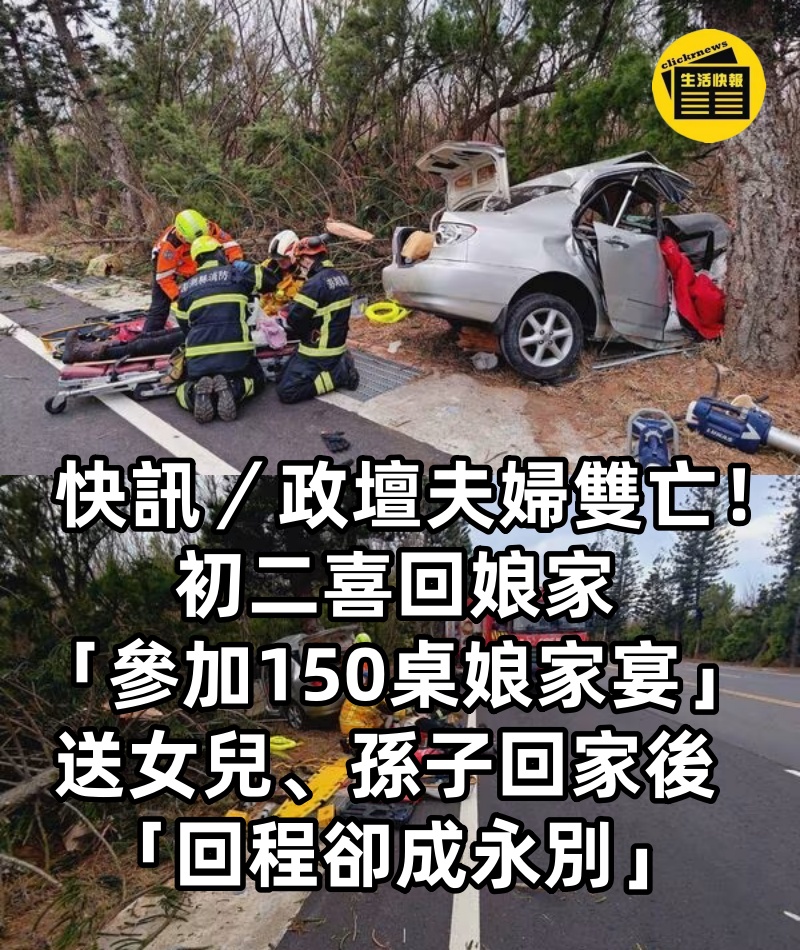 1/3 快訊/政壇夫婦雙亡!初二喜回娘家「參加150桌娘家宴」 送女兒、孫子回家後「回程卻成永別」 根據《ETtoday新聞雲》報導,澎湖白沙鄉18日下午發生一起令人悲痛的死亡車禍, 赤崁村村長黃禮聰與妻子在參加完村內盛大宴席後,於返家途中不幸自撞路樹雙雙喪命。