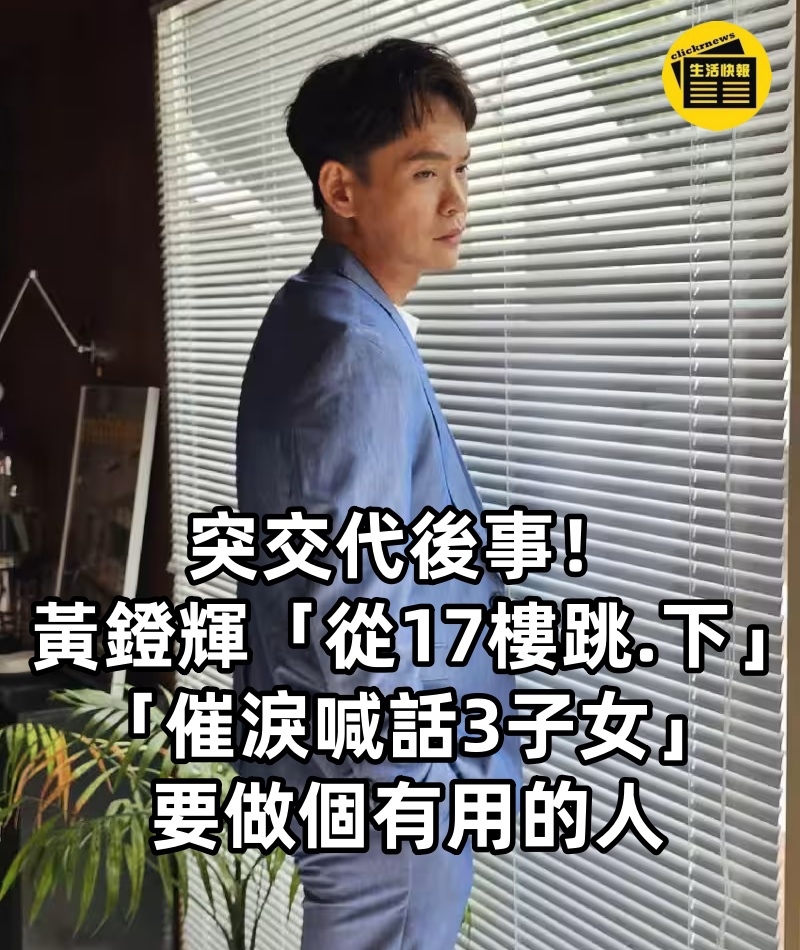 1/5 突交代後事! 黃鐙輝「從17樓跳下」 「催淚喊話3子女」:要做個有用的人。 資深男星黃鐙輝,無論是綜藝主持、或是演技表現,都十分亮眼,頗有觀眾緣! 戲外,他也是個愛家寵妻的好老公、好爸爸,和老婆萁萁結婚16年,育有一女二子,十分美滿幸福。 然而,近日卻爆出他毅然決然從