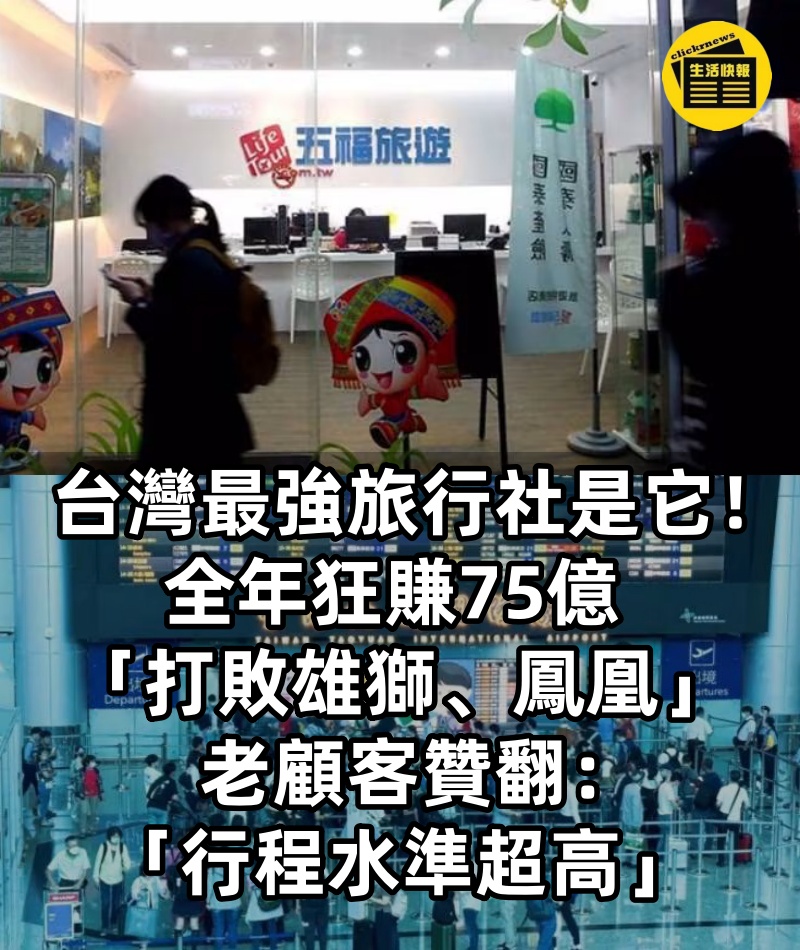 1/4 台灣最強旅行社是它!全年狂賺75億「打敗雄獅、鳳凰」老顧客贊翻:「行程水準超高」 根據《今日新聞》報導,台灣旅遊市場近年蓬勃發展,除了傳統龍頭雄獅旅遊外, 五福旅行社異軍突起,不僅在去年1月就創下7.02億元營收佳績, 打敗山富(5.52億元)、鳳凰(2.59億元)、