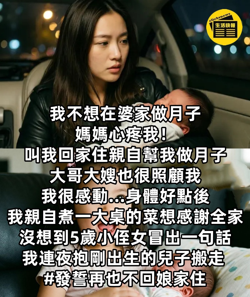 我不想在婆家做月子,媽媽心疼我,叫我回家住親自幫我做月子,住在家裡的大哥大嫂也很照顧我,我很感動….身體好點後我親自煮一大桌的菜想感謝全家,沒想到「5歲小侄女冒出一句話」我連夜抱剛出生的兒子搬走 #發誓再也不回娘家住