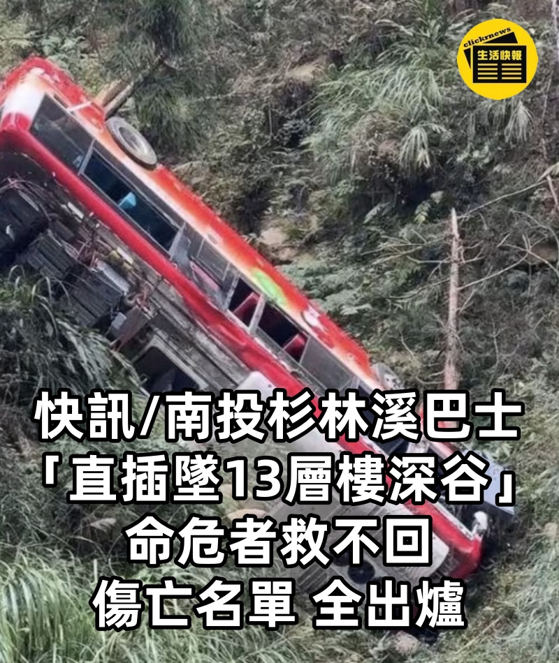 快訊 / 南投杉林溪巴士「直插墜13層樓深谷」!!命危者救不回「傷亡名單」全出爐