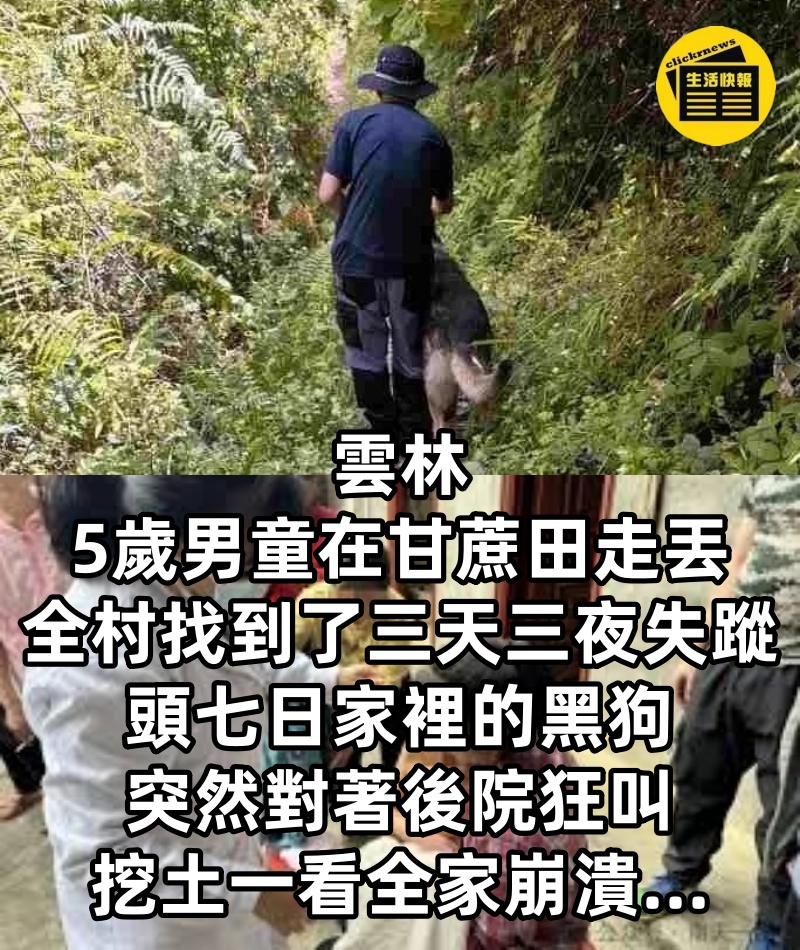 雲林5歲男童在甘蔗田走丟, 全村找到了三天三夜失蹤, 頭七日家裡的黑狗突然對著後院狂叫, 挖土一看全家崩潰…